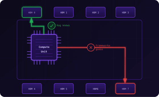 Precise access patterns reduce latency for device-wide primitives. Topology-aware algorithms steer every memory access toward its optimal physical location on the GPU. Most frameworks guess. Kog knows.